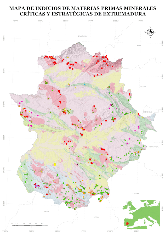 Mapa de Mapa de Materias Primas Minerales Críticas y Estratégicas de Extremadura