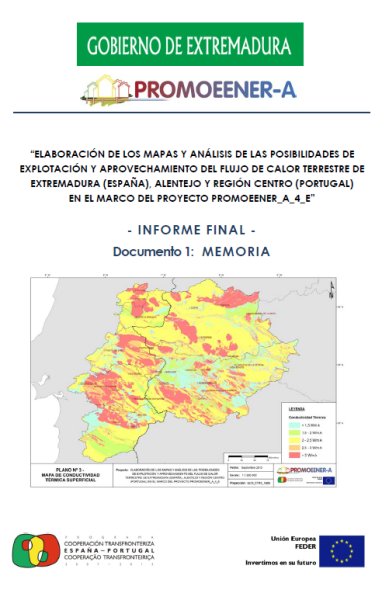 La Administración Mineraha elaborado el Mapa de Recursos Geotérmicos de Extremadura (España), Alentejo y Región Centro (Portugal), en el marco del proyecto de cooperación transfronteriza España-Portugal, denominado PROMOEENER-A (Promoción de la Energías Renovables en Edificios de la Administración Pública).